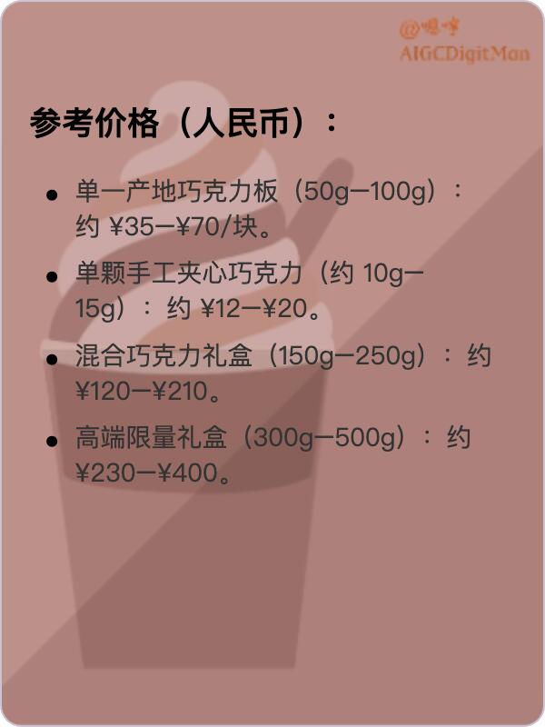 单颗手工夹心巧克力(约 10g–15g):约 ¥12–¥20。