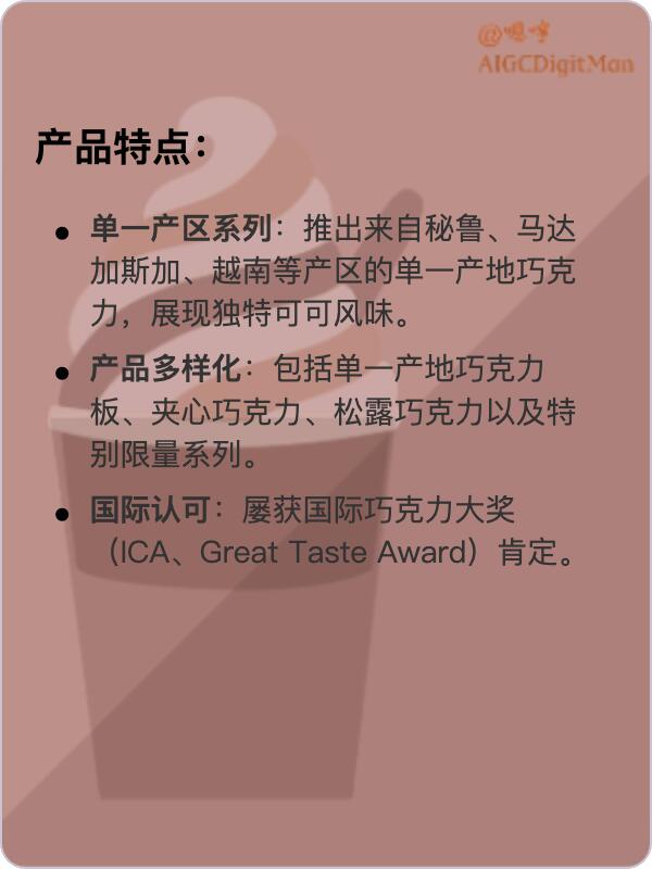 产品多样化:包括单一产地巧克力板、夹心巧克力、松露巧克力以及特别限量系列。