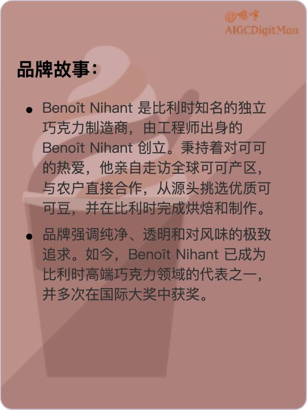 如今,Benoît Nihant 已成为比利时高端巧克力领域的代表之一,并多次在国际大奖中获奖。