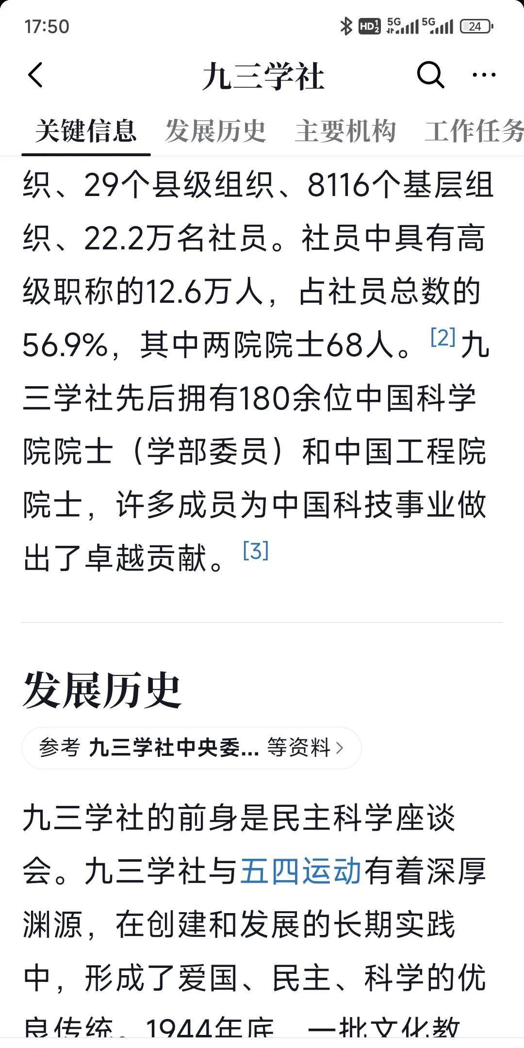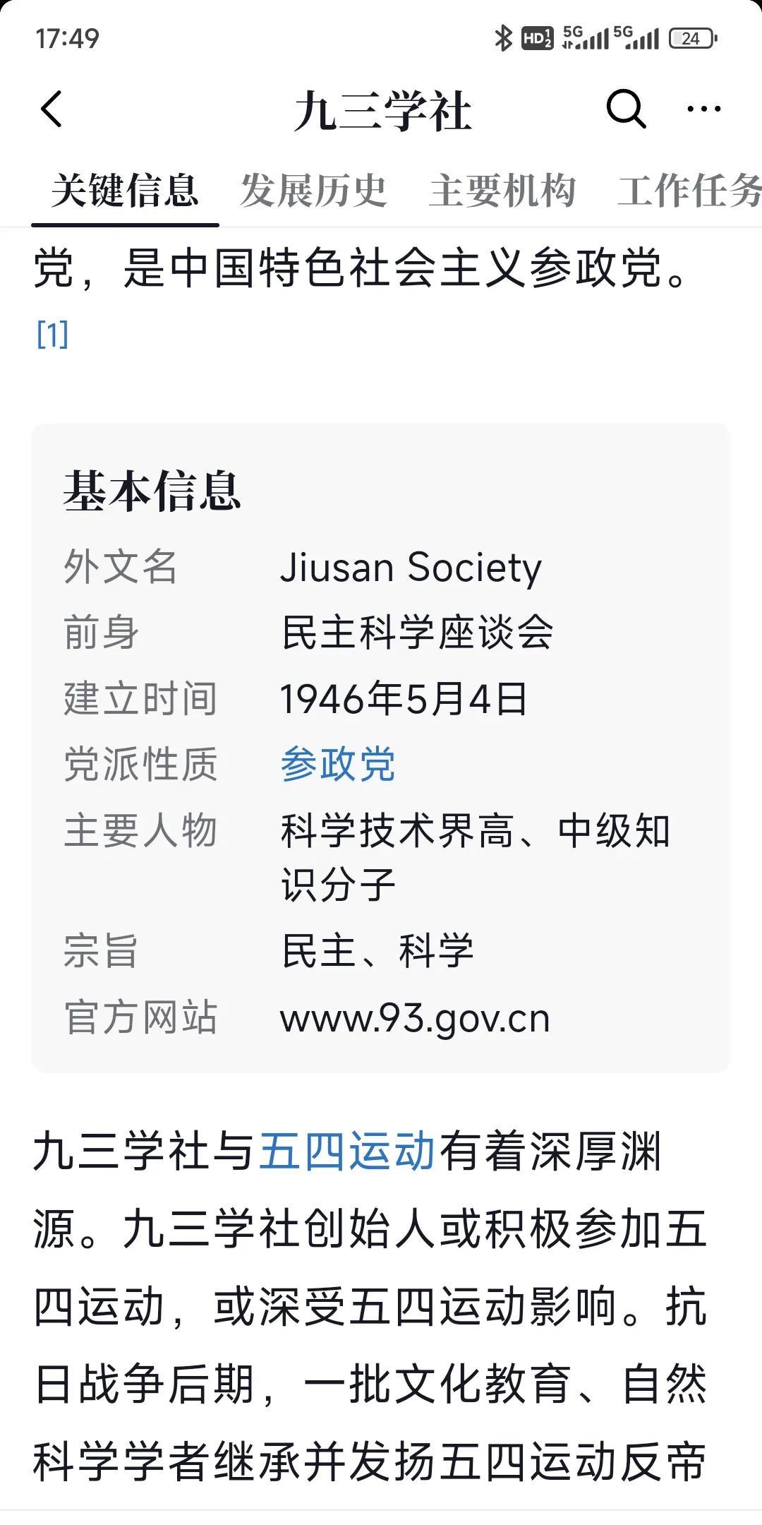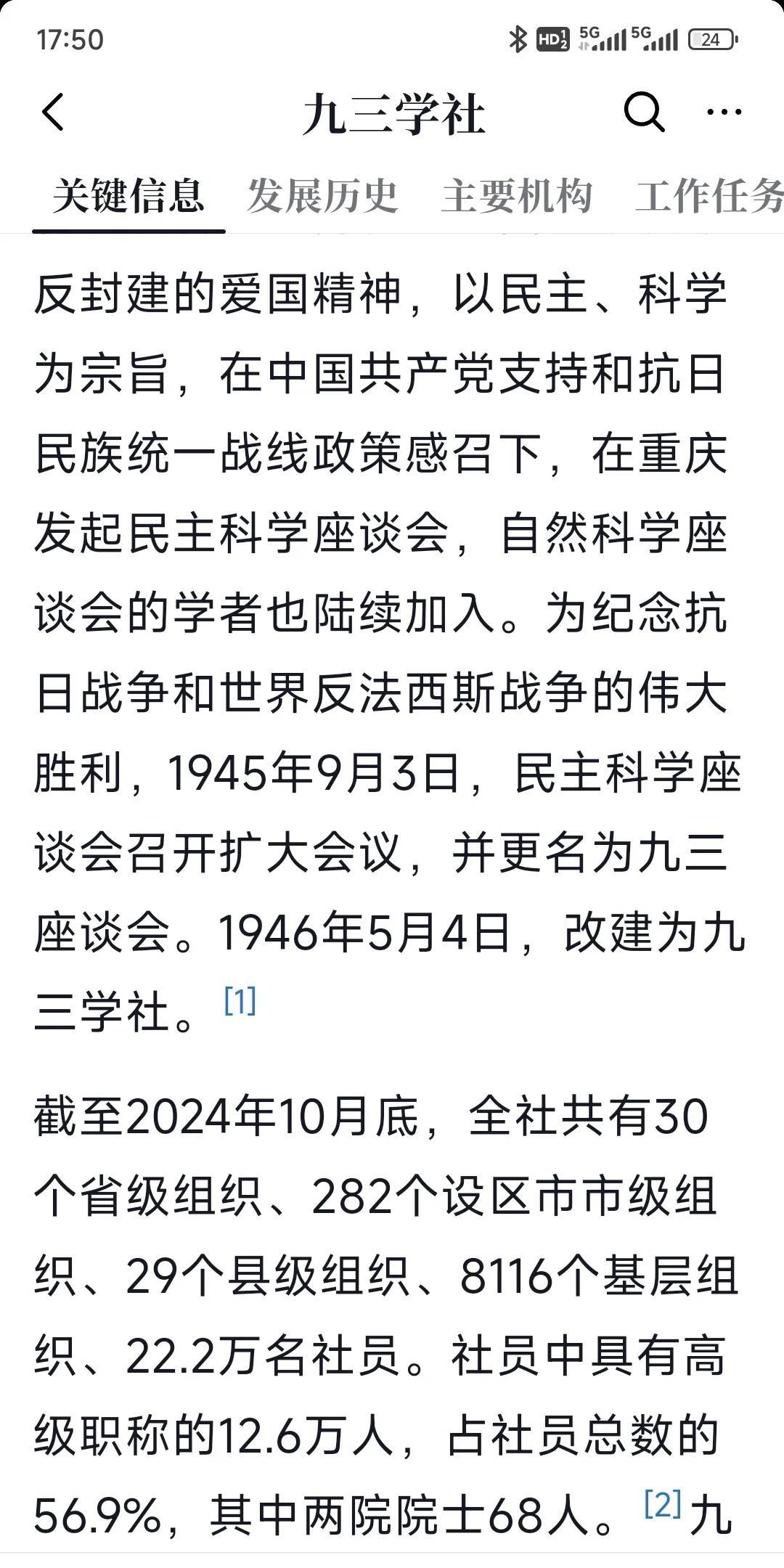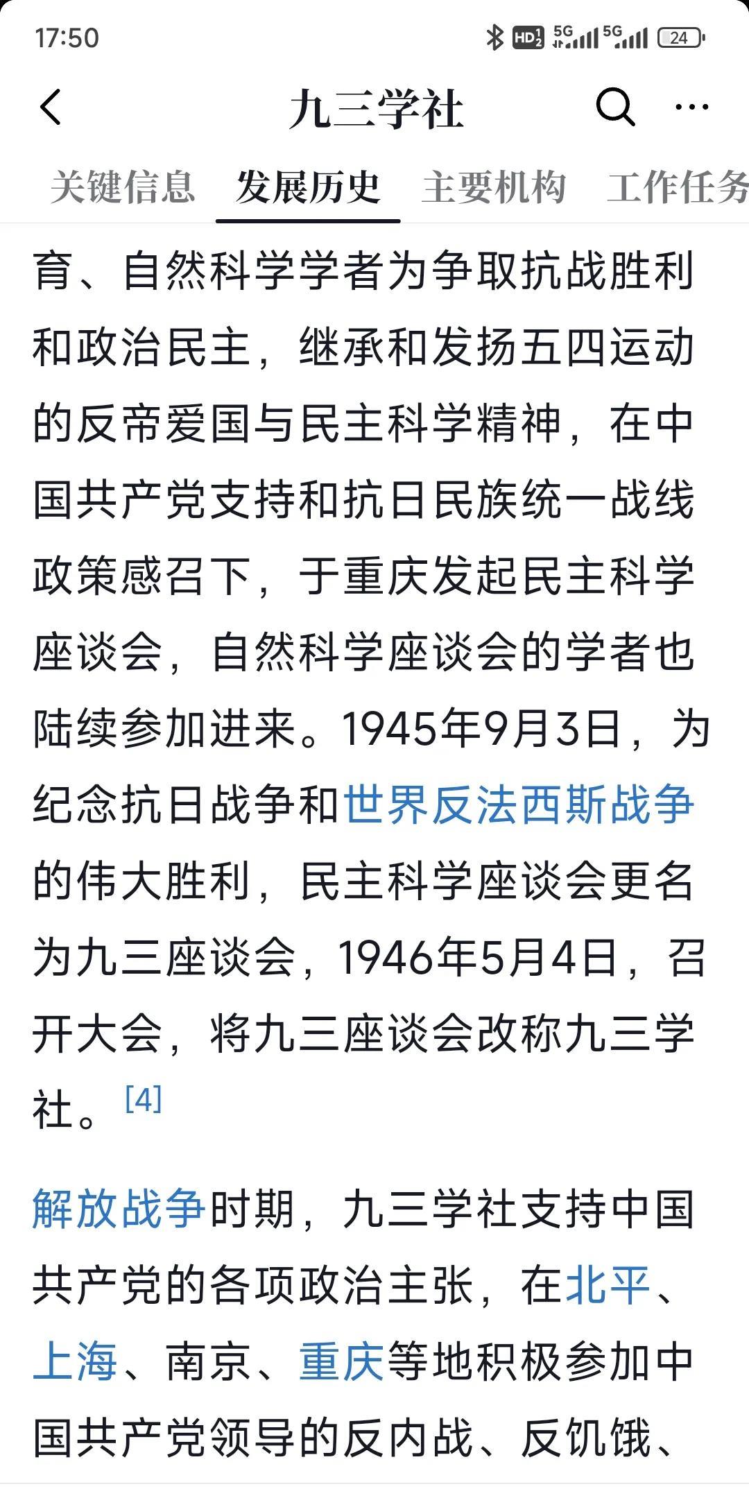 9月3日,中国抗日胜利纪念日,尤其今年是抗日胜利80周年,就对数字93格外关注。 也因此对一个党派九三学社突然感兴趣了。 第一次知道九三学社,是我高一的时候,政治老师给我们谈起的。 当时全班同学懵逼,基本都不知道。 那年,是1994年。 那时,高中生课外阅读实在贫乏,很少有同学家里书架有教科书以外书籍的。 这不是借口,可是我又突然发现,现在高中生家里书架堆满各种书籍,依然很少知道九三学社。 后来,进一步学习,终于知道九三学社是纯粹知识分子的组织,我笑了。 所以这证明,九三学社在基层,尤其是青少年那里毫无存在感,