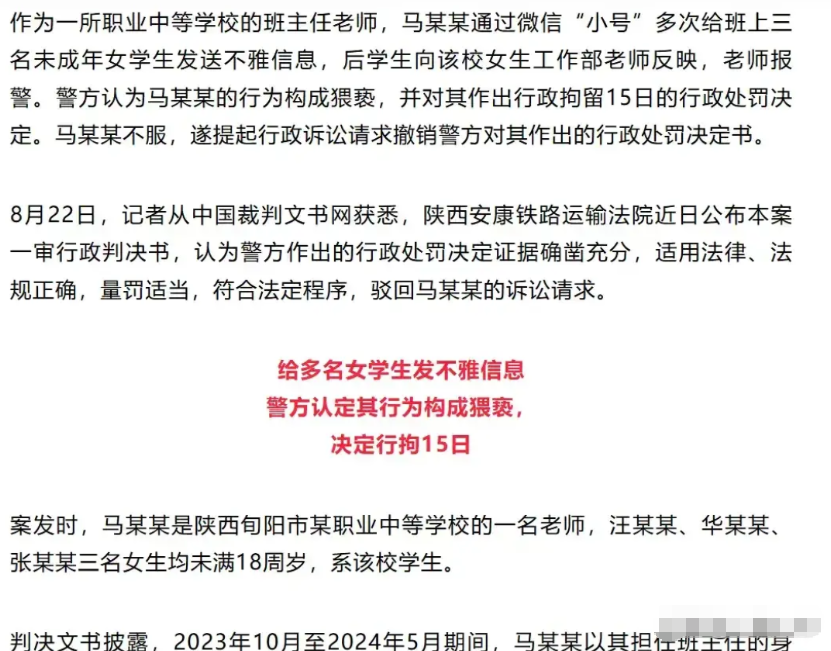 陕西安康,3名未满18岁的女生,收到班主任的信息,班主任让她们加小号为好友,她们以为是学习上的事,就加老师为好友了,结果老师给她们发了一些不雅信息,老师还想和她们发生关系,3名女生非常恐慌,就告诉了其他老师,她们报了警,但她们的班主任不服,他认为自己并没有接触3名女生的身体,他没有违法,他起诉要求撤销15日的行政处罚。