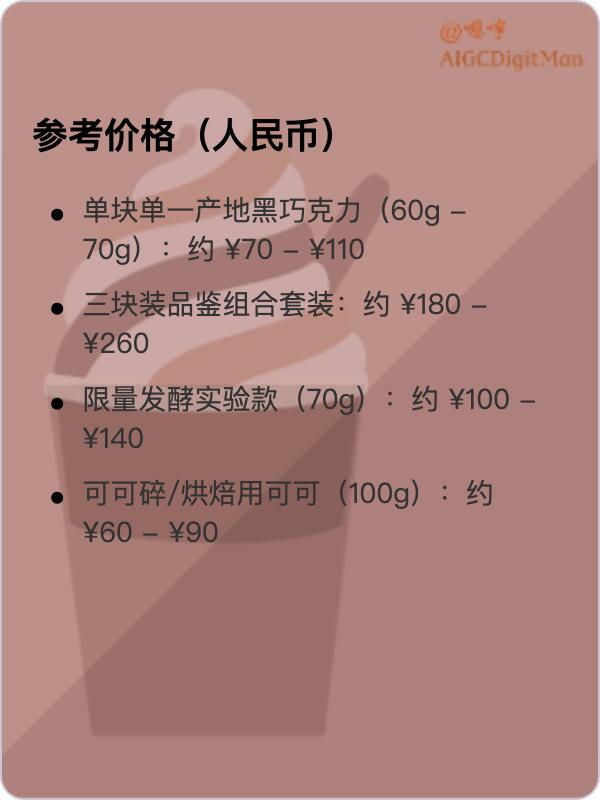 单块单一产地黑巧克力(60g - 70g):约 ¥70 - ¥110