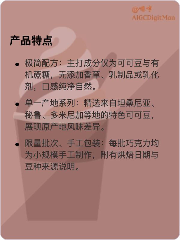 极简配方:主打成分仅为可可豆与有机蔗糖,无添加香草、乳制品或乳化剂,口感纯净自然。