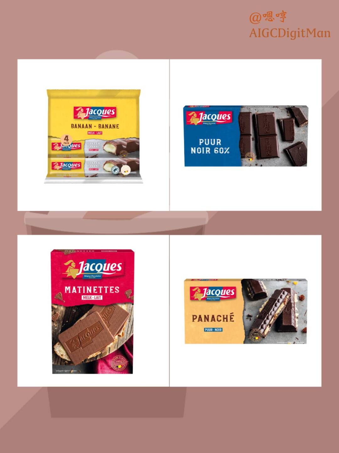 20世纪中期,Jacques 成为比利时第一批生产夹心巧克力棒和可可饮品的厂商之一。