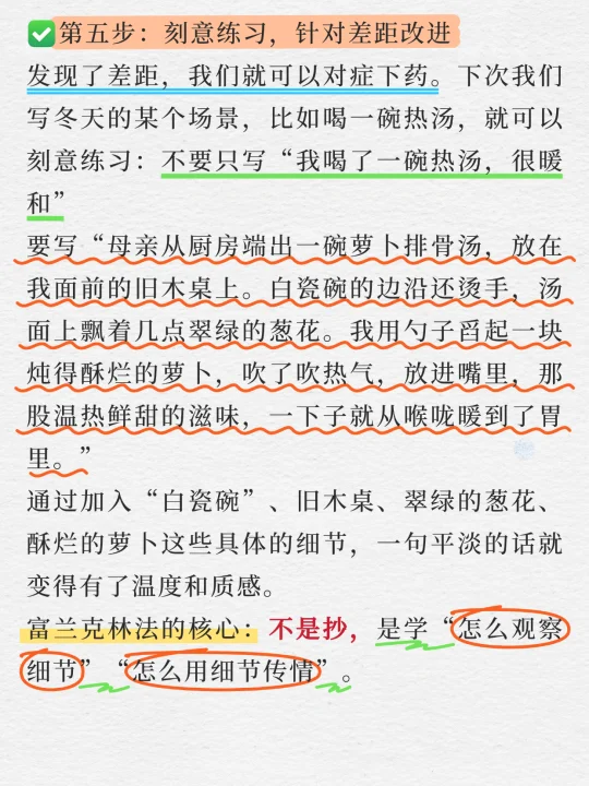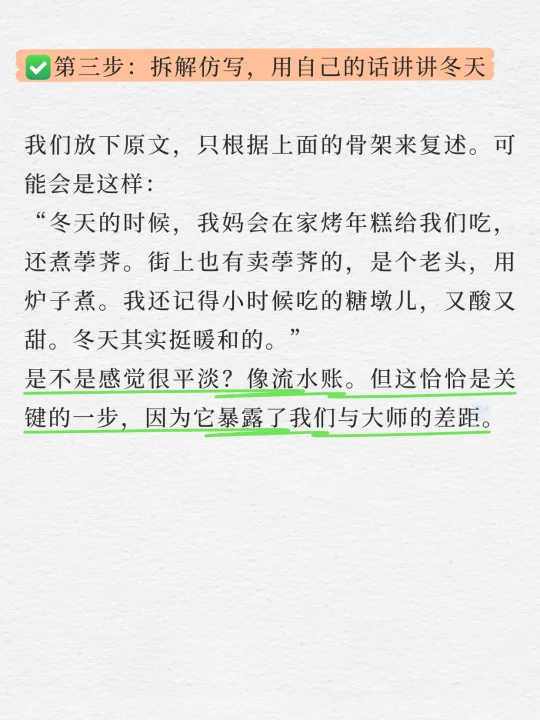 🌾针对发现的差距,进行专项改进和模仿。比如发现自己的句子都是长句,就刻意模仿原文的长短句结合;如果词汇单调,就学习原文中更精准、更生动的表达。不断重复这个过程,直到你的文章在神韵上能与原文媲美。