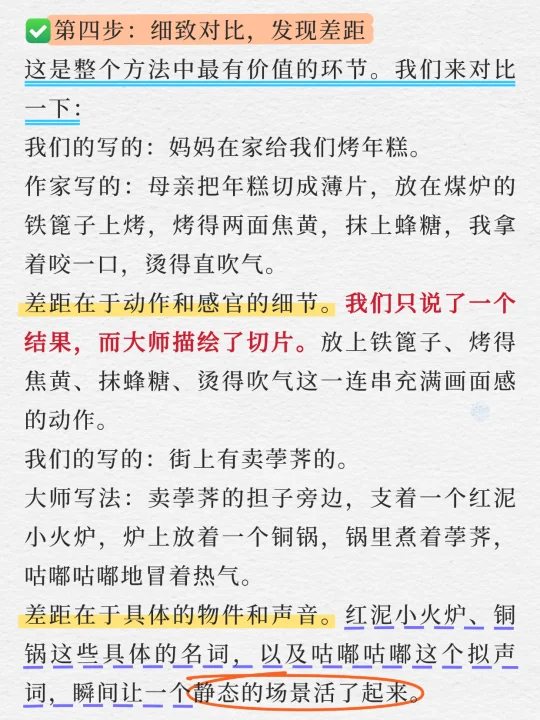 🍒这个方法的核心,简单来说,就是通过解构和重构优秀范文,进行高强度的模仿与对比,从而将大师的写作技巧内化为自己的能力。主要有以下几个关键步骤: