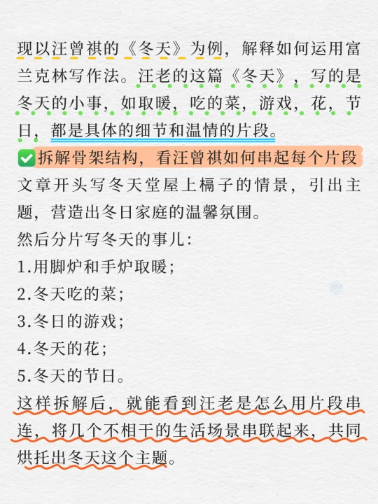 👆👆👆图片中就以汪曾祺的《冬天》为例,解释如何运用富兰克林写作法