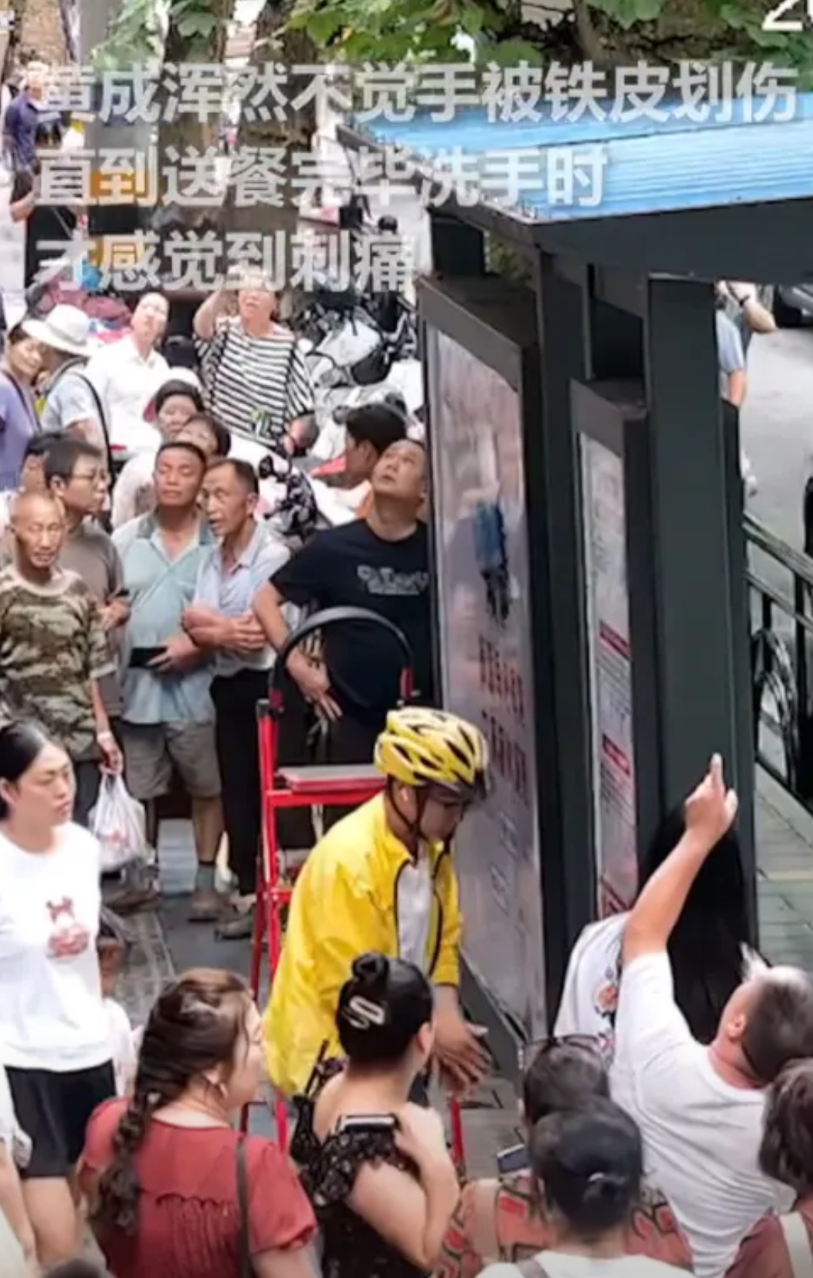 幸好有路人反应快,赶紧打了120,这时候,外卖小哥黄成正好送餐路过,他远远就看见围了不少人,走近一看这情况,想都没想就冲了过去,公交站的棚顶不算矮,他也顾不上危险,手脚并用地爬了上去。
