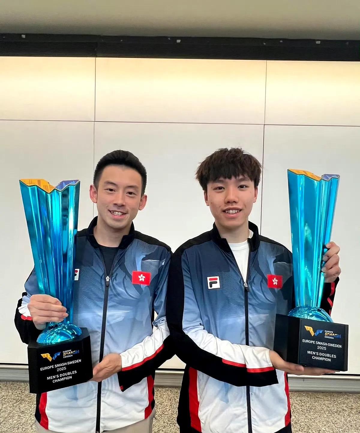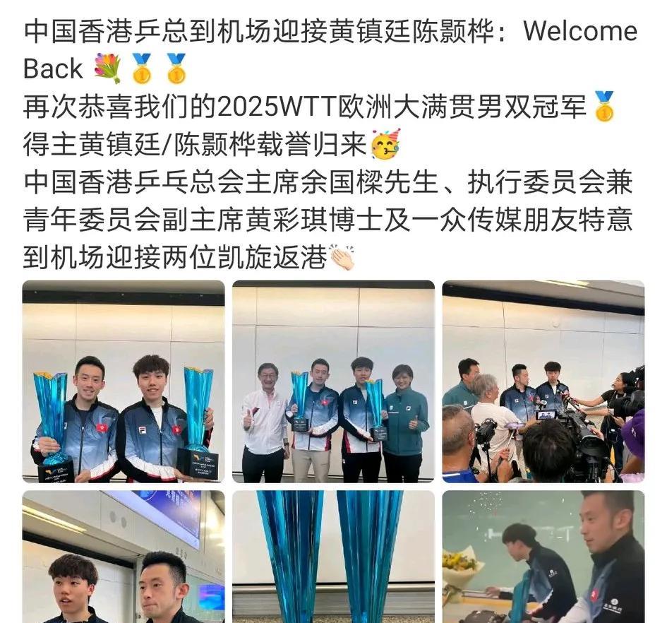 大圣和小陈已经回到香港了。 这是昨天颁奖结束后,黄镇廷、陈颢桦就从马尔默回去了吧,这次俩人拿了瑞典大满贯男双冠军载誉而归,中国香港乒总到机场迎接黄镇廷陈颢桦,并为他们两个人准备了鲜花,俩人一人推着一个大奖杯就出来了,不过这次瑞典大满贯奖杯的配色确实很好看呢,下次大圣和杜姐也一起拿个混双奖杯回来。 杜凯琹后面没比赛,和张瑞教练在马尔默还去海边玩了。在机场还有媒体采访两位,满满的仪式感,确实这次港队的男双打的不错,半决赛黄镇廷陈颢桦是赢了日本组合,决赛他们是赢了国乒林诗栋/黄友政,拿到男双冠军。 陈颢桦是左手,和大圣的男双打的不错,这个小孩儿也很有拼劲儿,大家说大圣终于等来了他的男左,在采访中大圣说俩人配了有一年时间吧,一年时间拿到大满贯赛冠军,也厉害了,这下男双可以拿到2000积分,排名一下就上去了。