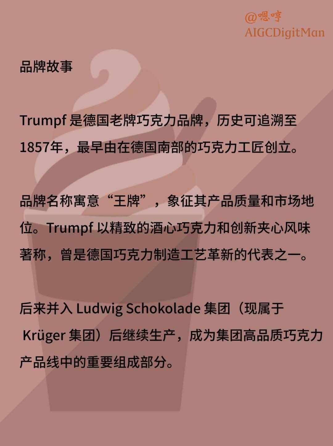 品牌名称寓意“王牌”,象征其产品质量和市场地位。Trumpf 以精致的酒心巧克力和创新夹心风味著称,曾是德国巧克力制造工艺革新的代表之一。