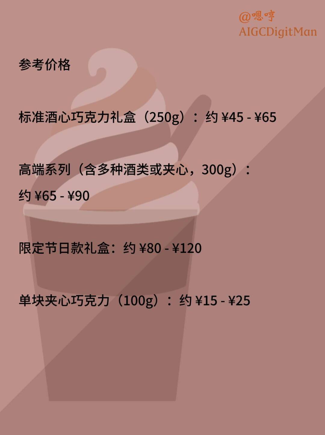 单块夹心巧克力(100g):约 ¥15 - ¥25