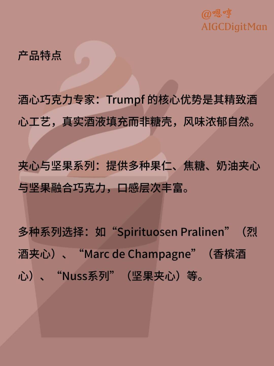 酒心巧克力专家:Trumpf 的核心优势是其精致酒心工艺,真实酒液填充而非糖壳,风味浓郁自然。