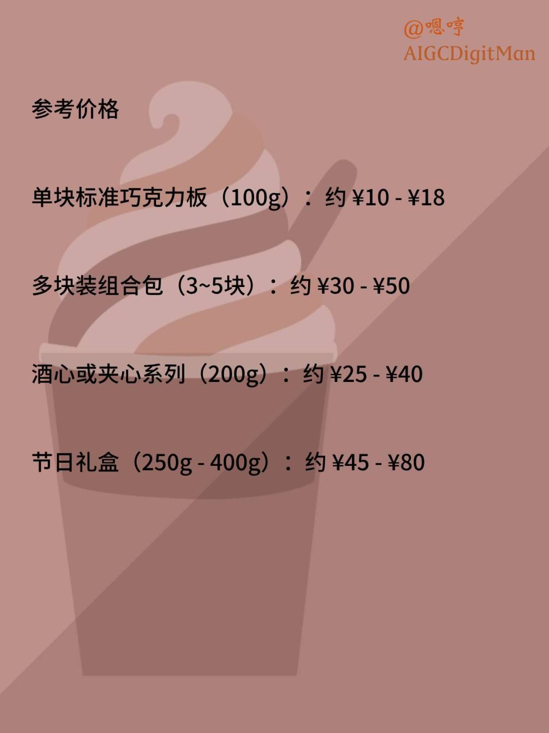 单块标准巧克力板(100g):约 ¥10 - ¥18