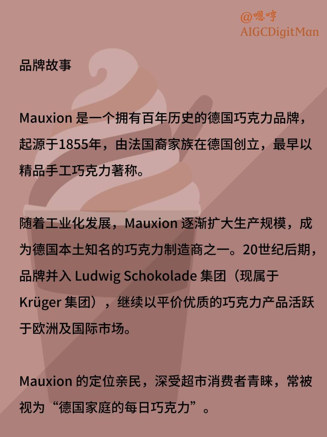 Mauxion 是一个拥有百年历史的德国巧克力品牌,起源于1855年,由法国裔家族在德国创立,最早以精品手工巧克力著称。