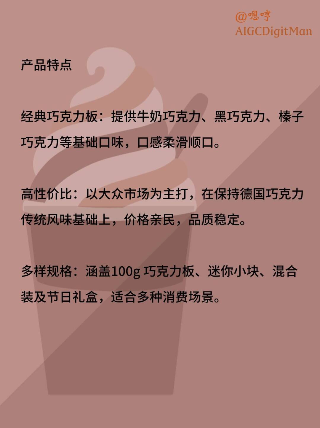 高性价比:以大众市场为主打,在保持德国巧克力传统风味基础上,价格亲民,品质稳定。