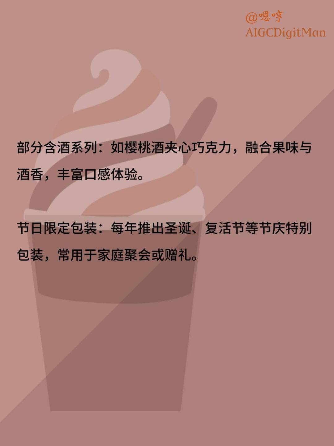 部分含酒系列:如樱桃酒夹心巧克力,融合果味与酒香,丰富口感体验。