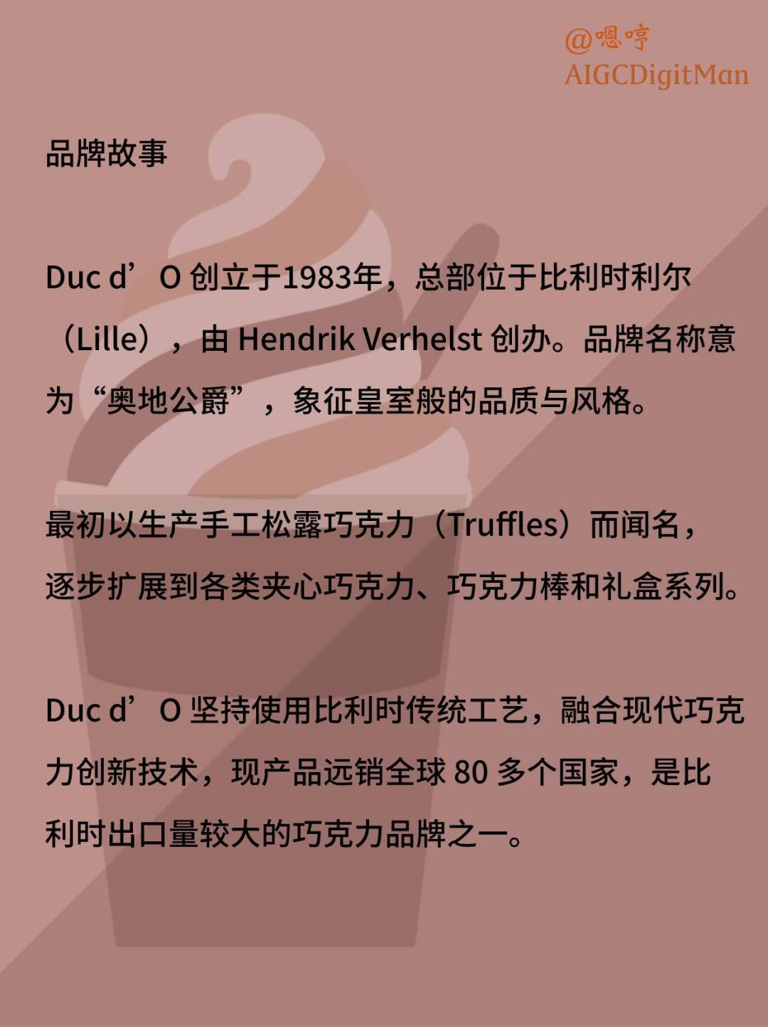 Duc d’O 坚持使用比利时传统工艺,融合现代巧克力创新技术,现产品远销全球 80 多个国家,是比利时出口量较大的巧克力品牌之一。