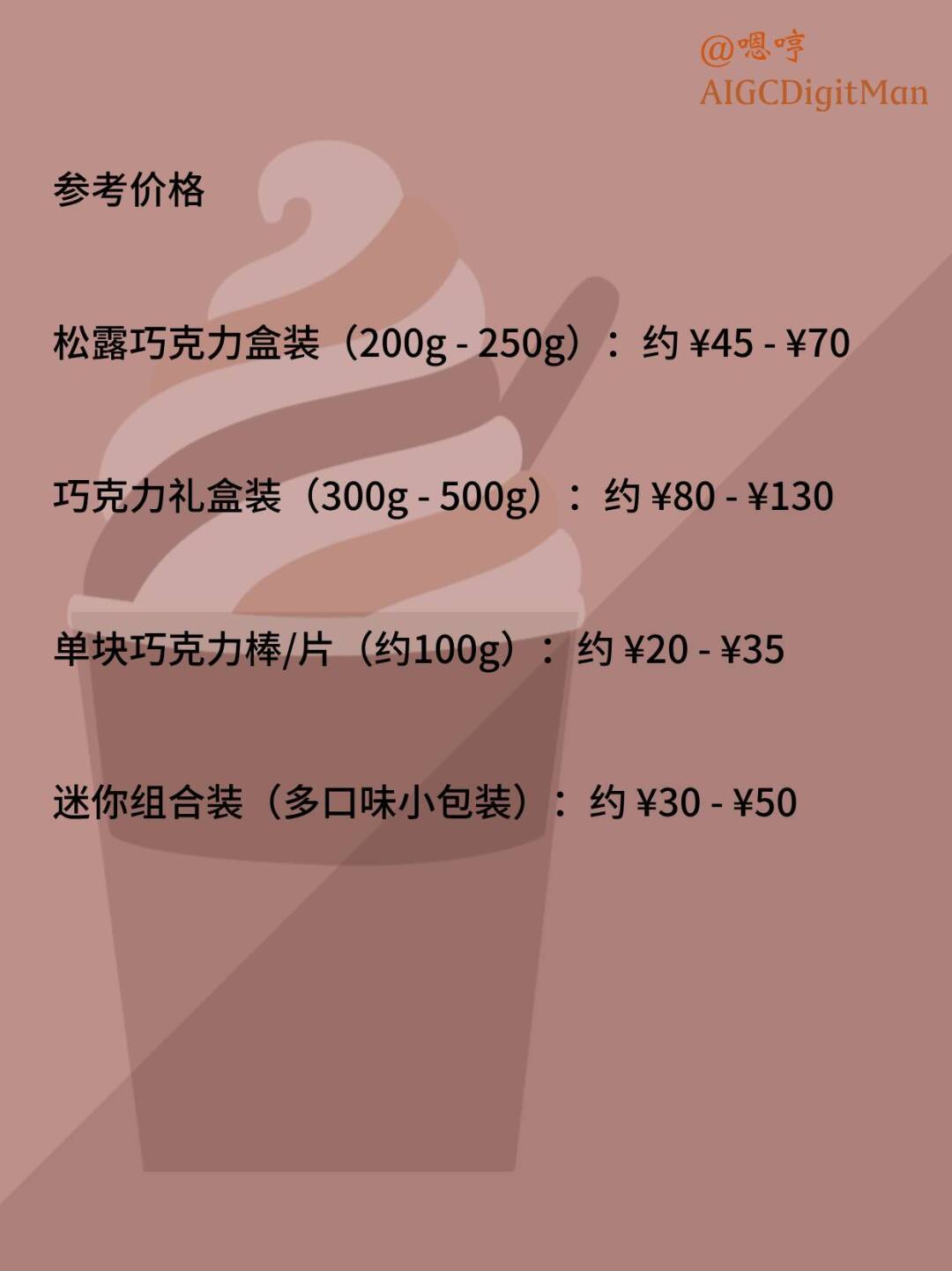 松露巧克力盒装(200g - 250g):约 ¥45 - ¥70