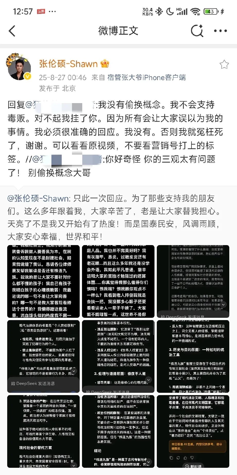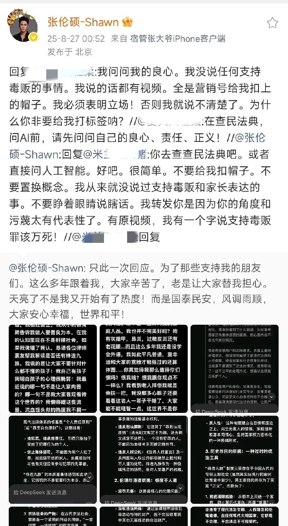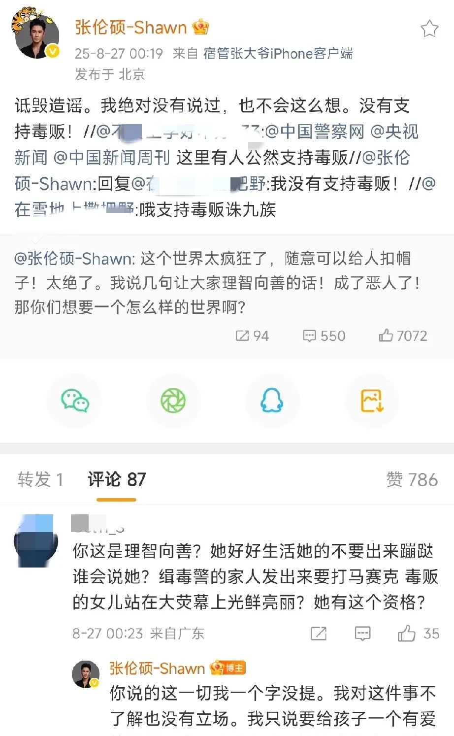 张伦硕真是给自己挖了个大坑呀,怎么会糊涂到为黄奕女儿发声。 这下好了,全网估计除了黄奕感谢他,全是骂他的。 说不定黄奕也会骂他多管闲事,本来事情热度已经降下去了,他又多嘴提起来,母女俩还得再被骂一遍。 张伦硕大半夜不睡觉,已经跟网友对线了几个小时了,一遍又一遍自证,可感觉他说的越多,好像错的越多。 建议他安安静静让网友骂几天,别再解释了,网友不会买账的。 作为公众人物,还是谨言慎行吧,不能啥流~量都蹭啊,便宜没捞着,还惹一身sao。