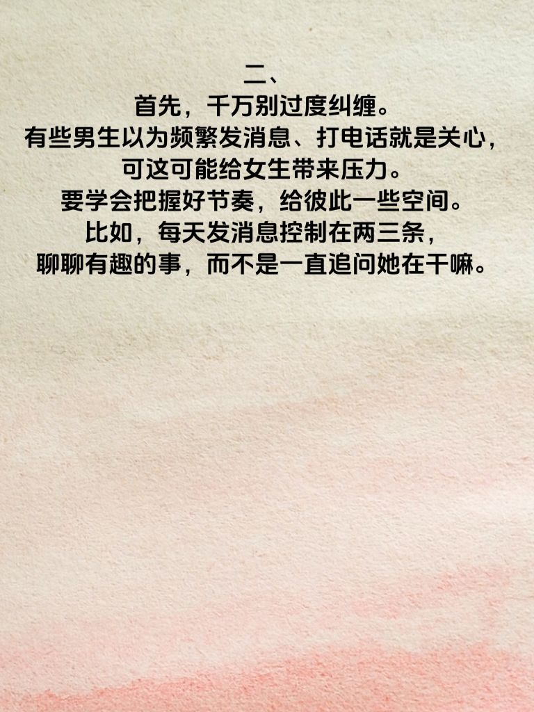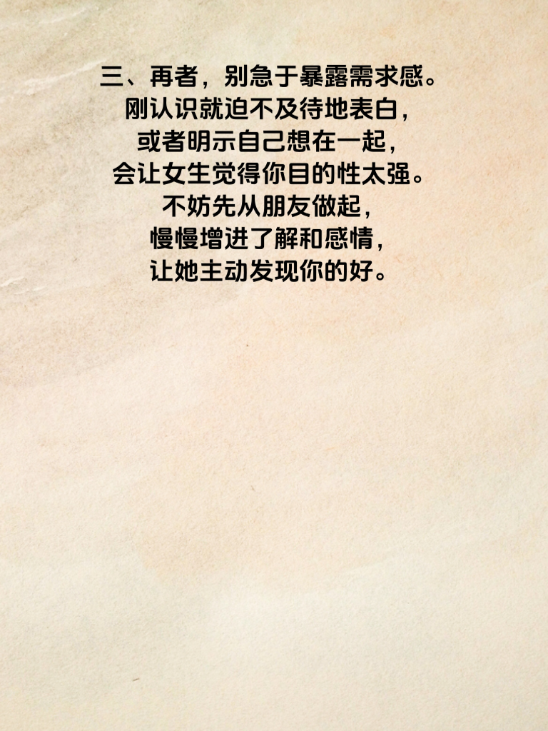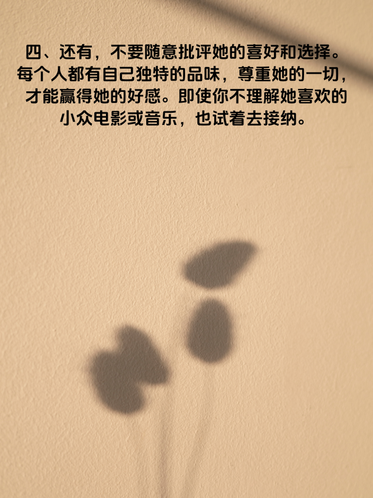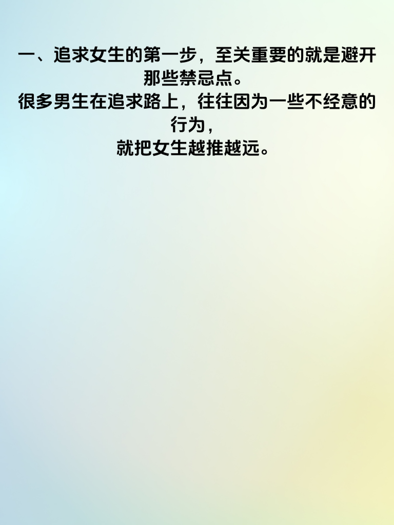 一、追求女生的第一步,至关重要的就是避开那些禁忌点。很多男生在追求路上,往往因为一些不经意的行为,就把女生越推越远。 二、首先,千万别过度纠缠。有些男生以为频繁发消息、打电话就是关心,可这可能给女生带来压力。要学会把握好节奏,给彼此一些空间。比如,每天发消息控制在两三条,聊聊有趣的事,而不是一直追问她在干嘛。 三、再者,别急于暴露需求感。刚认识就迫不及待地表白或者明示自己想在一起,会让女生觉得你目的性太强。不妨先从朋友做起,慢慢增进了解和感情,让她主动发现你的好。 四、还有,不要随意批评她的喜好和选择。每个人都有自己独特的品味,尊重她的一切,才能赢得她的好感。即使你不理解她喜欢的小众电影或音乐,也试着去接纳。 五、最后,别忽略自身形象。外表整洁得体,内在积极向上,才能给女生留下好印象。注重个人修养,提升自己的魅力,才是长久吸引女生的关键。避开这些禁忌点,你的追爱之路会更加顺畅。