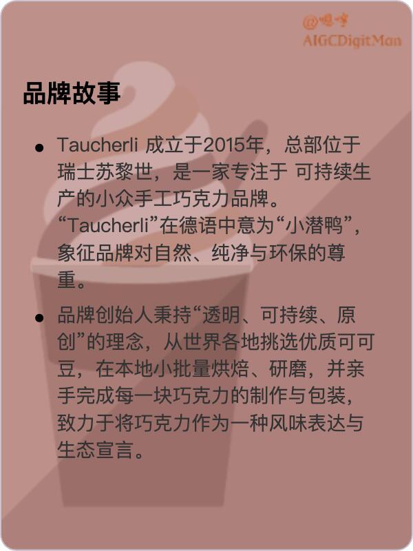 Taucherli 成立于2015年,总部位于瑞士苏黎世,是一家专注于可持续生产的小众手工巧克力品牌。