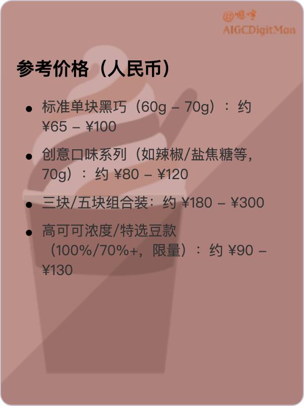 标准单块黑巧(60g - 70g):约 ¥65 - ¥100
