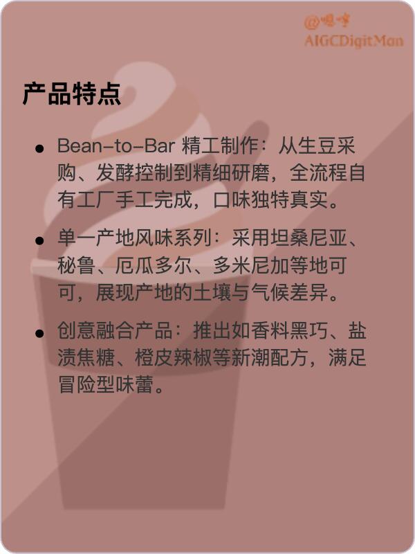单一产地风味系列:采用坦桑尼亚、秘鲁、厄瓜多尔、多米尼加等地可可,展现产地的土壤与气候差异。