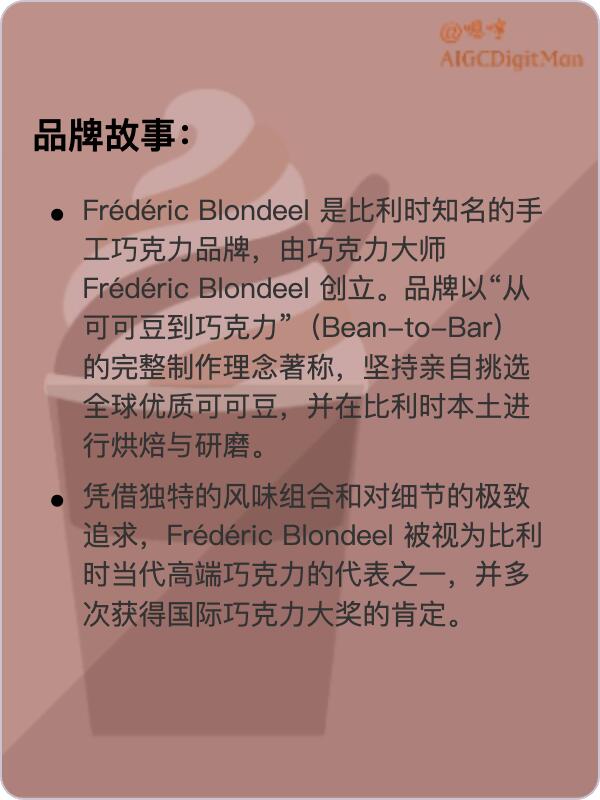 凭借独特的风味组合和对细节的极致追求,Frédéric Blondeel 被视为比利时当代高端巧克力的代表之一,并多次获得国际巧克力大奖的肯定。