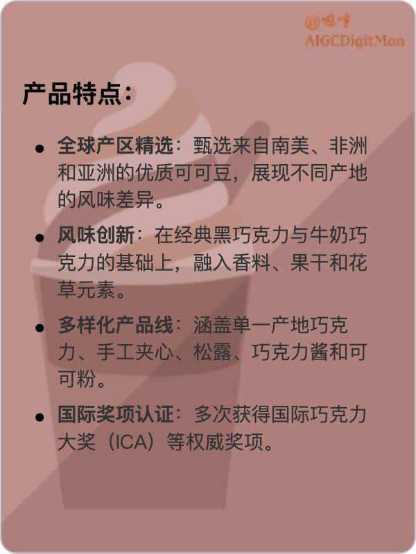 多样化产品线:涵盖单一产地巧克力、手工夹心、松露、巧克力酱和可可粉。