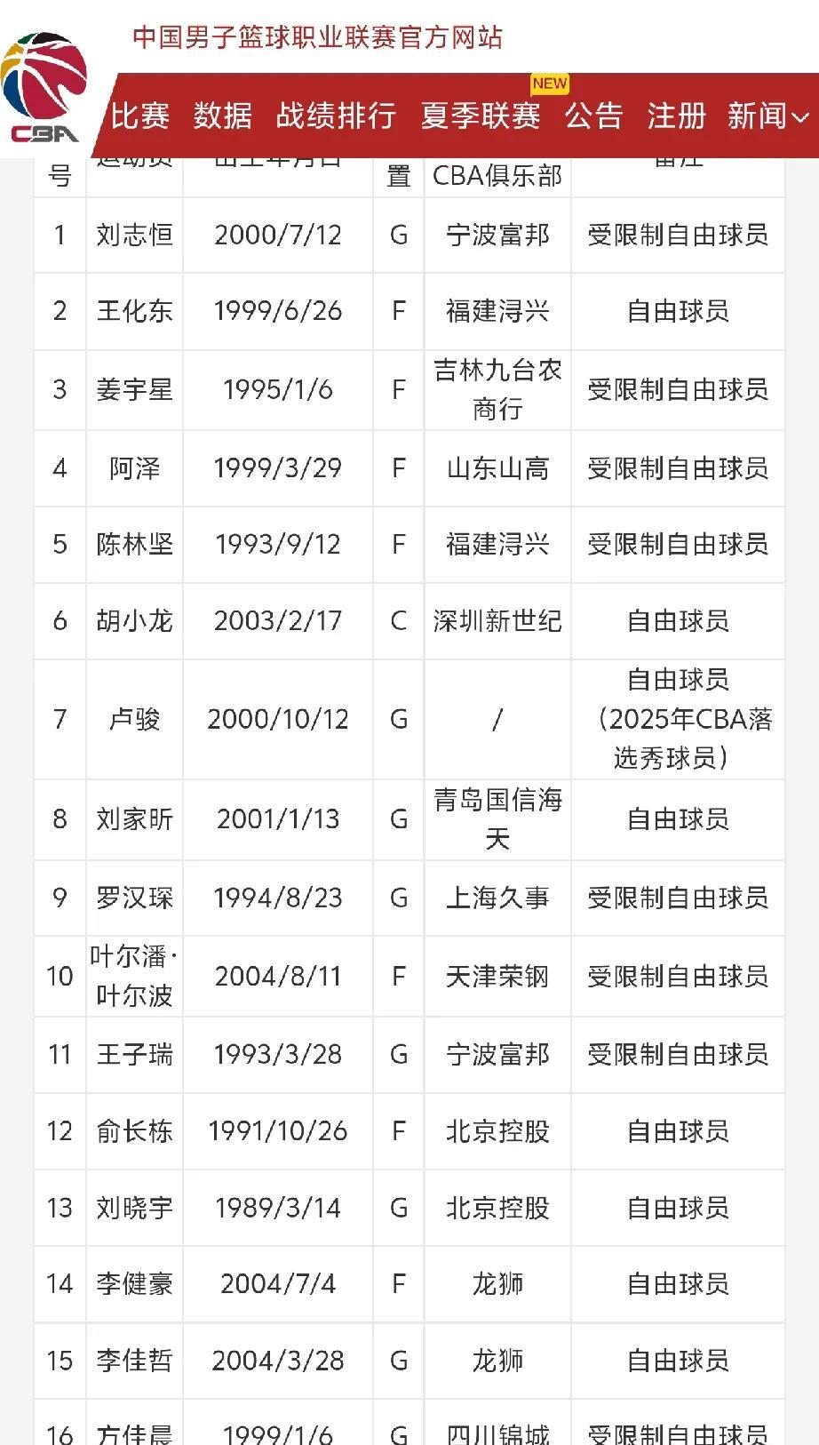 吉林核心领衔、天津四川吉林快来认领! CBA自由球员名单27日更新,姜宇星、王化