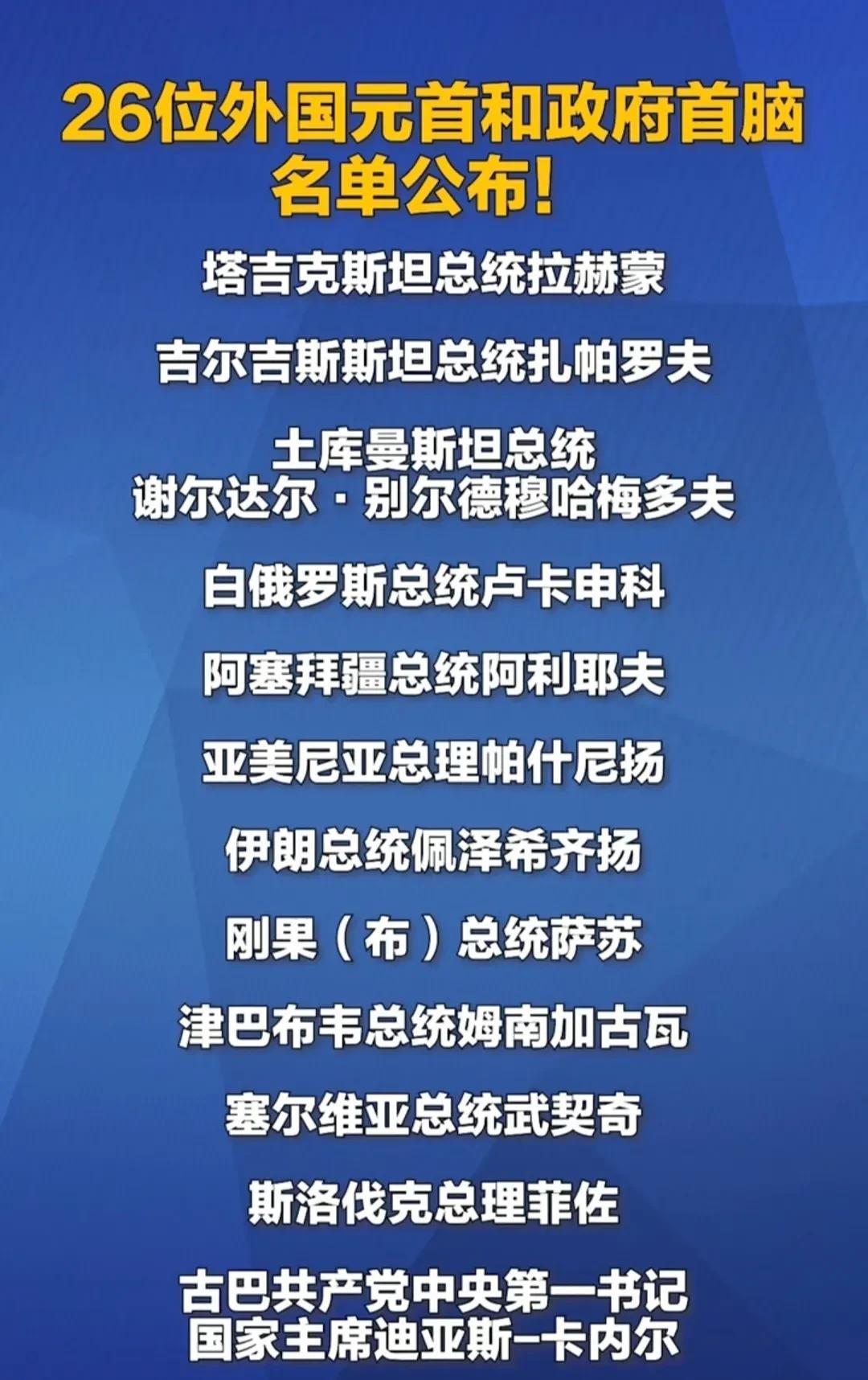名单出来了! 一共有26位外国元首和政府首脑出席! 排在首位的是俄罗斯总统普京,