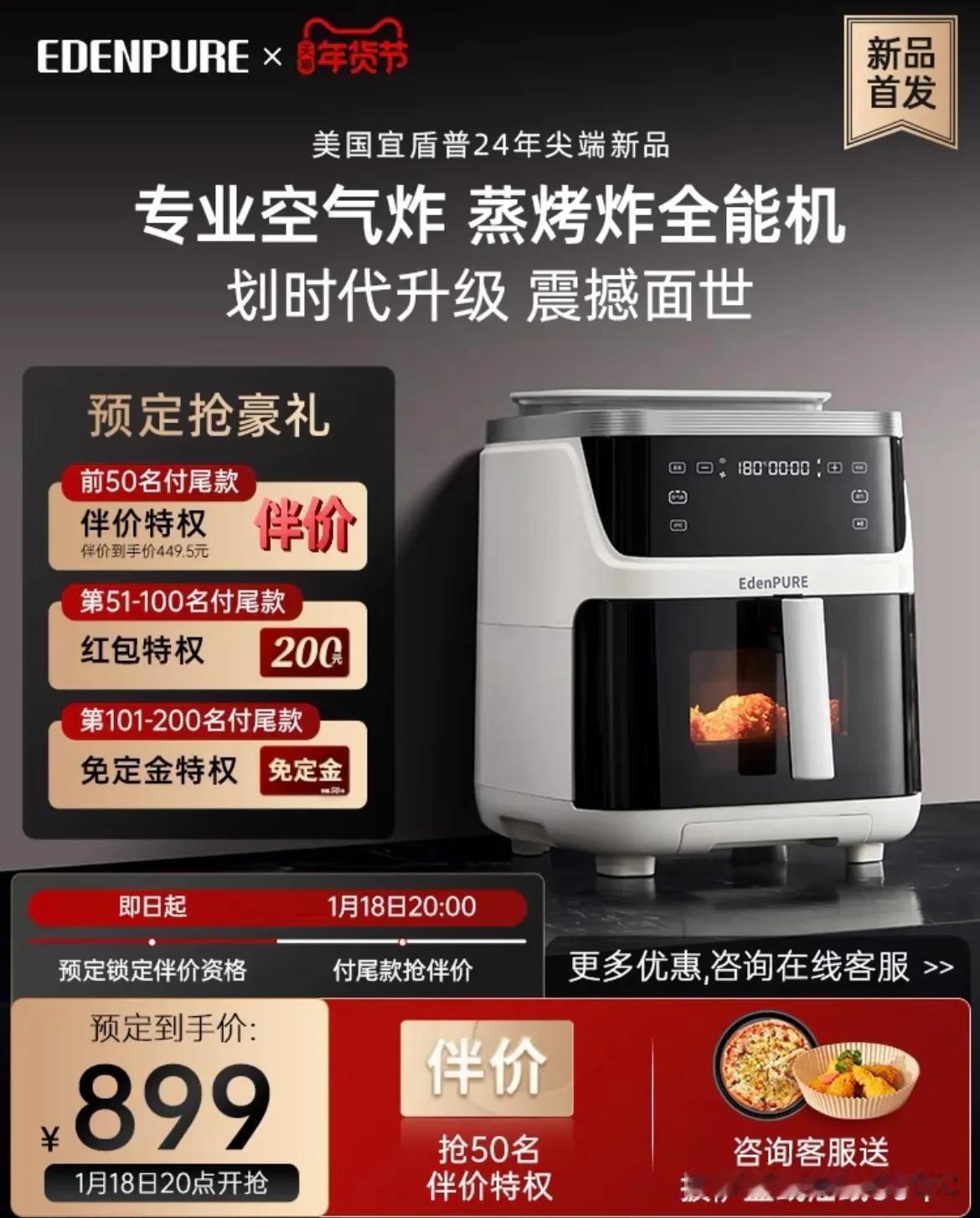 终于找到了一款满意的空气炸锅。它既不会像蒸烤箱那么占地方,又有烘烤、蒸汽烤以及空气炸的功能。 关键它的价格要比蒸烤箱便宜太多了,几百块钱就能入手,真的是性价比很高啊。 7升容量,功能很强大,可以纯蒸,蒸气烤,空气炸,还可以加热饭菜,做干果。 📣📣📣这款空气炸锅18号晚上8点有半价(到手只需449.5元) 需要的小伙伴现在就可以预定了,18号晚上8点抢伴价和赠品。全年坠划算的优惠活动,千万不要错过哦~