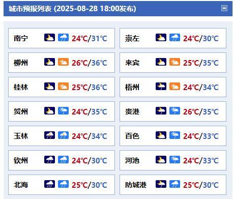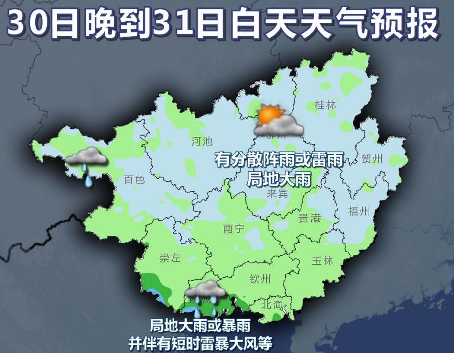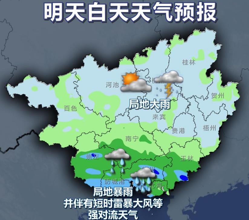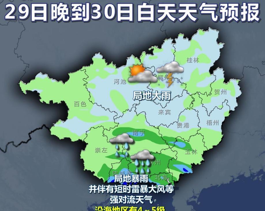 #广西天气# 【热带低压已经生成 桂南及沿海一带将迎风雨天气】今天晚上,北海、钦州、防城港、梧州、玉林、贵港等市有小到中雨、局地大雨或暴雨并伴有短时雷暴大风等强对流天气,其它地区多云有分散阵雨或雷雨。 明天白天,北海、钦州、防城港、玉林、贵港、南宁、崇左等市有中到大雨、局地暴雨并伴有短时雷暴大风等强对流天气,其它地区多云有阵雨或雷雨、局地大雨。 29日晚上到30日白天,桂南部分地区有中到大雨、局地暴雨并伴有短时雷暴大风等强对流天气,其它地区多云有阵雨或雷雨、局地大雨。沿海地区有4~5级、阵风6~8级东北风。 30日晚上到31日白天,桂西南和沿海地区有中雨、局地大雨或暴雨并伴有短时雷暴大风等强对流天气,其它地区多云有分散阵雨或雷雨、局地大雨。 南宁市:今天晚上多云有阵雨,明天白天中雨、局地大雨或暴雨,偏东风2~3级,最低气温24℃,最高气温32℃。(广西气象台28日17时发布预报)
