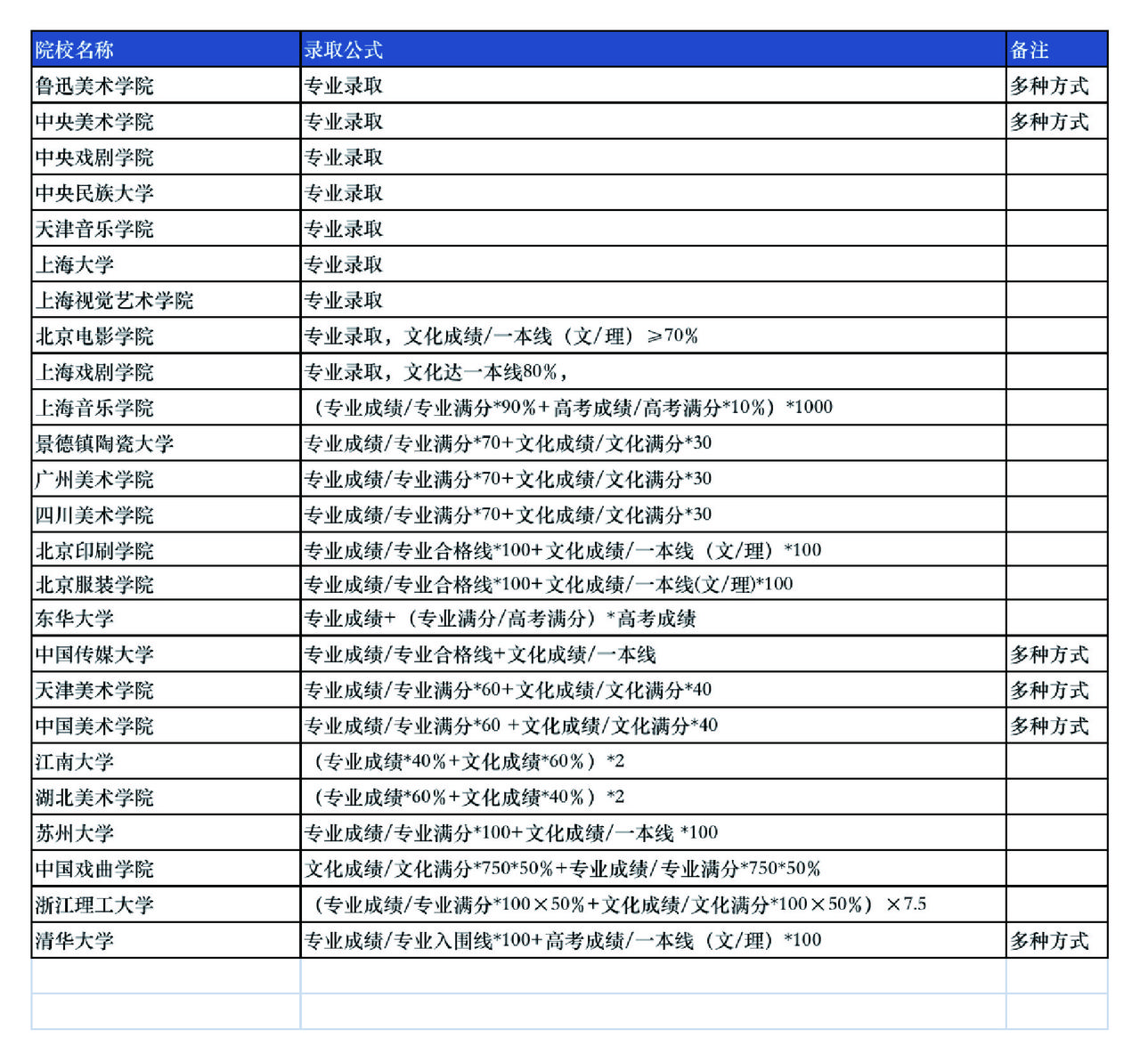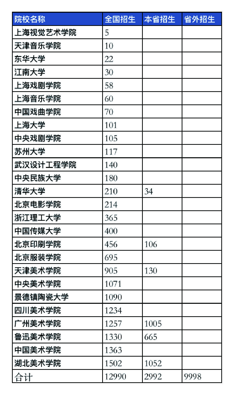 2022年美术生最全面的校考分析来了。今年举办校考的学校一共有50所左右; 其中有20多所学校是滥竽充数的,你们一定要擦亮眼睛不要被蒙骗了啊! 这些学校都是民办的三本学校,学费高得离谱,名字特别有迷惑性,除非你家里有矿,不然宁愿复读也不要被骗去考这种学校! 除了这些烂学校之后,只有27所是正儿八经的美术类好学校,是值得参加校考的学校! 今天,我们就来重点说一说这27所学校! 大家来看一下第一张图; 在这27所学校里面,其中有2所学校是面向本省招生的,分别是广西艺术学院和山东艺术学院。 实际上大部分考生能报考的只有25所学校而已,而且在这25所学校里面,还有一部分不是面向全国招生的。 所以美术生参加校考,能做选择的选择其实也并不多! 好,那我们就来重点分析一下这25所学校的招生情况。 看第二张图: 这25所校考院校的招生人数是12990人,其中有2992个名额是留给本省招生的,面向全国招生的人数只是9998。 以今年60万左右的美术生总人数来看,只占了美术生群体的1.7%左右。 当然了,并不是所有的美术生都会去参加校考的,但是不管怎么样,肯定不会低于10万人,所有理想情况下,校考的录取率也不到10%,也就是每10个参加校考的人数里面,只有1个能被录取,如果你的联考成绩很差,画室不行,那就别去当炮灰了。 但是大家肯定会觉得自己感知到的数据要远比我说得要高,对吧? 实际上你们看到的是拿到合格证的人数,而不是录取的数据。 按照往年的录取情况来看,初试的合格证是按照录取人数的1:8来发放的,复试的合格证是按照1:4来发放的。 所以给你们的错觉就是觉得校考很容易,但是拿到合格证并不能代表被录取,在拿到合格证的人数里面,每四个只录取1个; 不过这个数据,画室肯定不会给你们看的。 好,那这些学校里面,有哪些是比较好考的呢? 我们分别从招生人数、考试内容、录取规则来看,都有哪些学校适合你们的。 首先从招生人数上来看:录取人数最少的前五名分别是: 上海视觉艺术学院5人 天津音乐学院10人 东华大学22人 江南大学30人 上海戏剧学院58人; 这里的招生人数是指校考的招生人数,不是学校实际的招生人数,比如江南大学和东华大学,在很多省份都是用联考成绩来招生的。 那招生人数最多的前五名分别是: 四川美术学院1234人; 广州美术学院1257人,其中本省招生1005; 鲁迅美术学院1330人,其中本省招生665; 中国美术学院1363人; 湖北美术学院1502人,其中本省招生1052; 所以从招生人数上来看,湖北和广东的美术生参加本省校考的录取率还是挺高的,但是对于外省的考生来说,考这两个学校明显就比较困难了。 实际上,面向全国招生人数最多的是,中国美术学院,接下来是川美和景德镇陶瓷大学。 从录取方式来看: 大致分为按专业录取和按综合分录取两种方式; 看第三张图: 按照专业分录取的学校有9个,分别是:鲁迅美术学院、中央美术学院、中央戏剧学院、中央民族大学、天津音乐学院、上海大学、上海视觉艺术学院、北京电影学院、上海戏剧学院; 如果文化不错,但是专业不是特别好的,就可以选择:北服、浙江理工、天津美术学院这类学校校考; 你们可以根据自己的成绩来看看自己适合哪一种; 从考试的内容来看,也大致分为两种,分别是设计类的和传统美术类的; 看第四张图: 像北服、北京印刷、北京电影、上海戏剧和美院的设计类专业都是考设计类的内容。 如果你的联考成绩不好,最后选择拼一把的话,我建议就别选择传统的素描、速写。色彩多了,还不如背稿子拼一把呢。 不管选不选择校考,更重要的是要根据考生的情况,来做好接下来的升学规划,对目标的设定、专业的选择和行业的选择远比分数更重要。