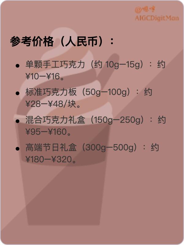 单颗手工巧克力(约 10g–15g):约 ¥10–¥16。