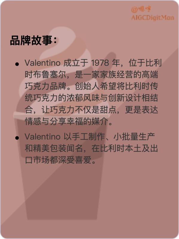 Valentino 成立于 1978 年,位于比利时布鲁塞尔,是一家家族经营的高端巧克力品牌。