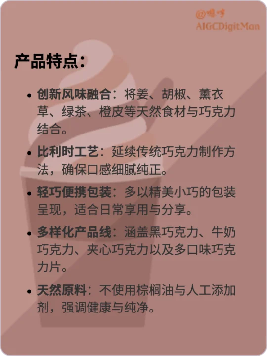 比利时工艺:延续传统巧克力制作方法,确保口感细腻纯正。