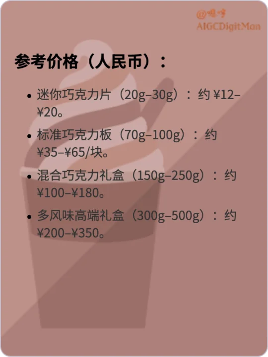 迷你巧克力片(20g–30g):约 ¥12–¥20。