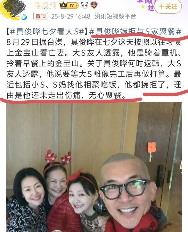 七夕,具俊晔现身,骑着心爱的小摩托去墓地看望大S,给大S带了面包和黑咖啡,还在墓地摆放了和爱妻的合照,S妈和小S约他吃饭,他也婉拒了,一时间,不知道具俊晔是真深情还是演戏,说什么的都有,有的说能一直这么深情,相信他是真爱了,有的说,在一起时不珍惜,人走了,搞这些仪式给谁看,让粉丝看吗? 讲真,去年大S在的时候,七夕节光头回了韩国老家,连句祝福也没有,现在人没了,倒是注重仪式感了,确实让人质疑光头的爱有几分,不过,相信遗憾是肯定有的,大S对他的付出比对汪小菲多,可以肯定的是大S很爱他,不然也不会吃回头草了,具俊晔再也找不到像大S这么爱他的人了,应该也很懊恼当初没能及时施救吧!