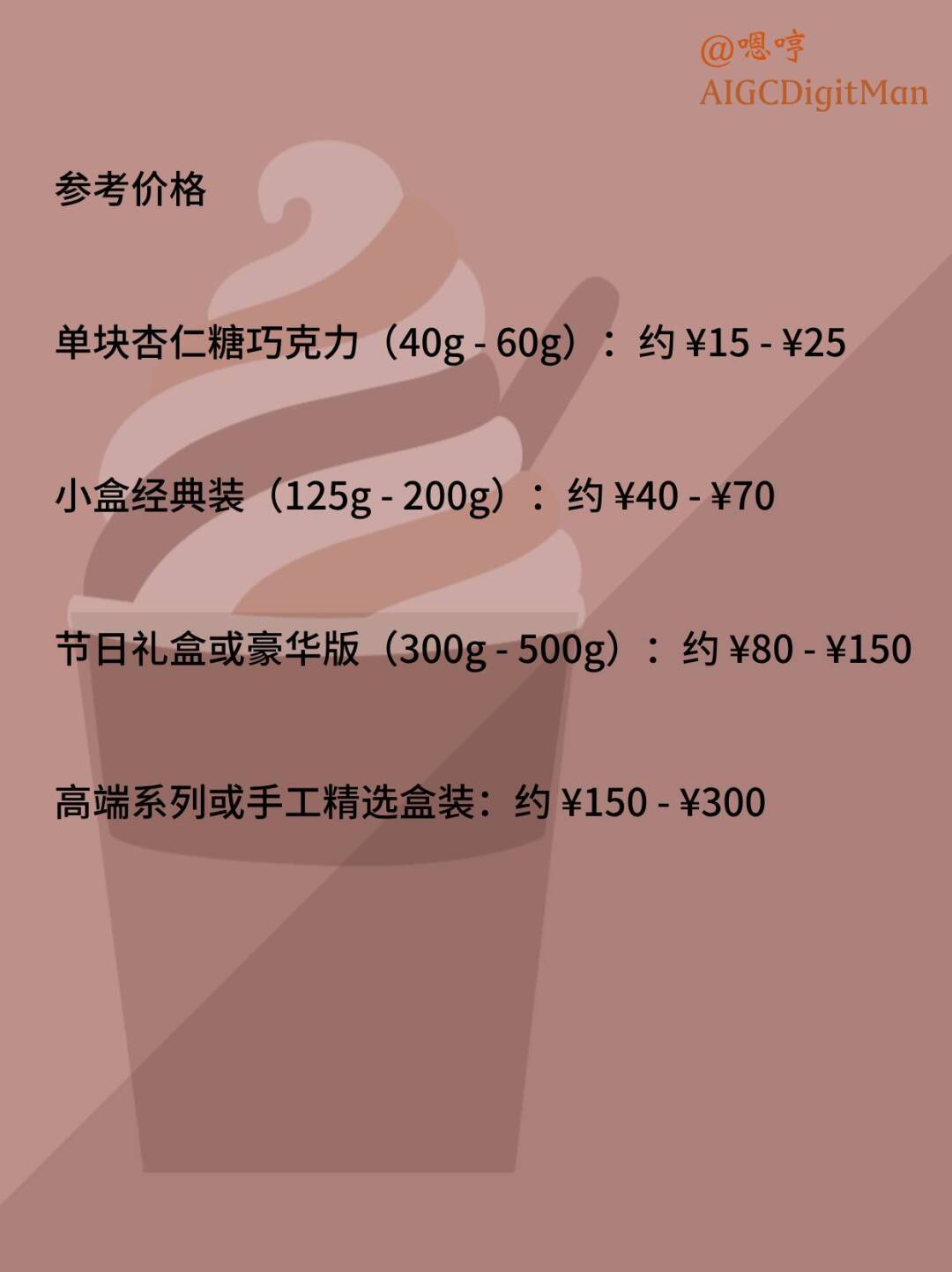单块杏仁糖巧克力(40g - 60g):约 ¥15 - ¥25