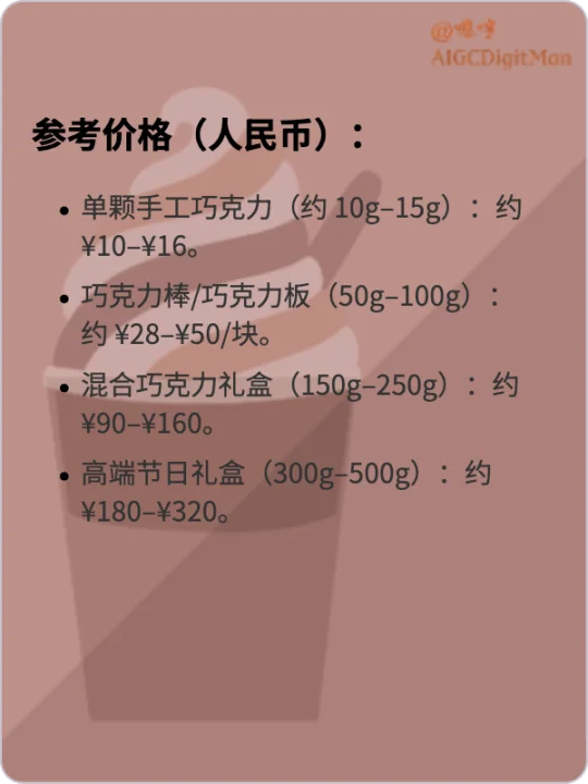 单颗手工巧克力(约 10g–15g):约 ¥10–¥16。