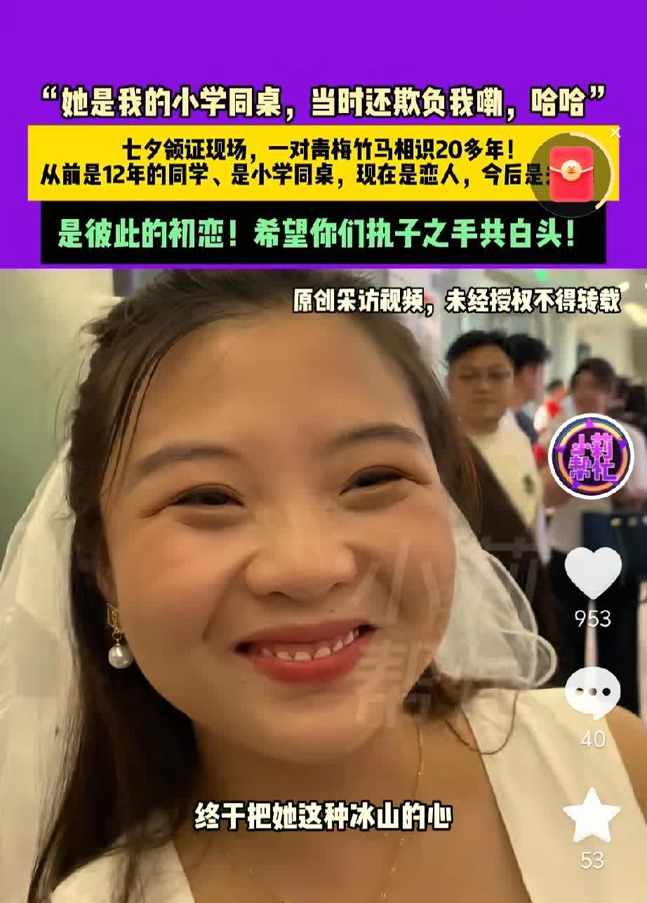 8月29日,河南郑州,七夕领证现场,一位女生穿着婚纱,笑得格外甜。原来他们一对是青梅竹马,相识20多年,从校园到婚纱,听着他们的情感经历,简直是羡煞旁人! 男子说:“我们小时候就认识了,那时候我们同学,她老是欺负我,我就不和她坐了,不和她玩儿了。”女生站在他旁边笑个不停,可能也想到了小时候打他的趣事吧! 男子接着说:“高中结束的时候对女生产生了好感,上大学也在一个学校,就开始追她,那时候她特别高冷,在我的热烈追求下,她这颗冰山的心也暖化了!” 不得不说,这一对真的是太暖、太甜蜜了!彼此知根知底,20多年的情谊,小学的同桌,现在的恋人,以后的夫妻,还是对方的初恋,简直是命中注定的缘分。希望他们执子之手,与子偕老,幸福一辈子!