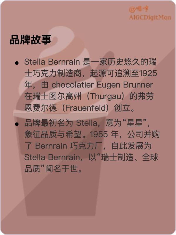 品牌最初名为 Stella,意为“星星”,象征品质与希望。1955 年,公司并购了 Bernrain 巧克力厂,自此发展为 Stella Bernrain,以“瑞士制造、全球品质”闻名于世。