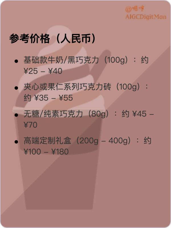 基础款牛奶/黑巧克力(100g):约 ¥25 - ¥40