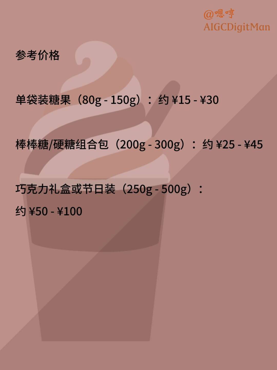 单袋装糖果(80g - 150g):约 ¥15 - ¥30