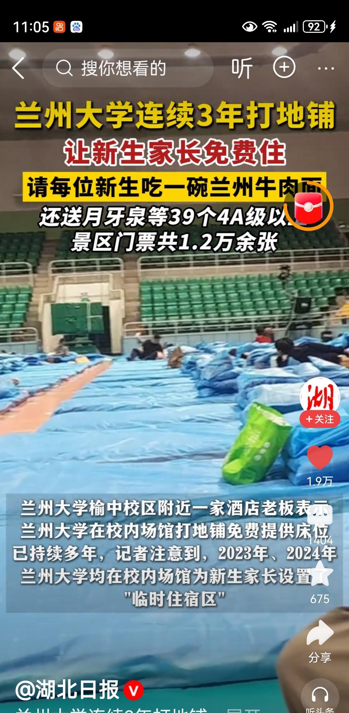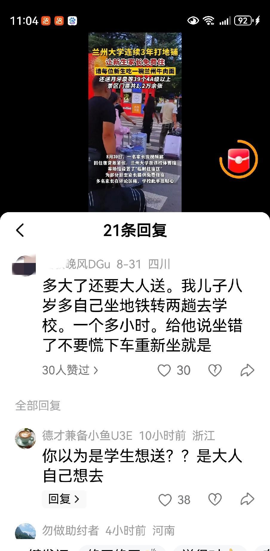 孩子上大学了,您会亲自送他(她)去吗?近日,兰州大学这波操作火出圈了。连续三年在体育馆临时搭建地铺住宿区,配备全套干净被褥,让新生家长免费住,24小时热水供应。还请每位新生吃一碗兰州牛肉面,还送月牙泉等39个4A级以上景区的门票。 虽然兰州大学位置有些偏远,因地域原因总被唱衰,但凭借为新生提供的一系列暖心福利,为这所名校又赢得了热度,这才是大学应该有的温度!让每一个孩子都能在父母的陪伴下,安心地踏入大学校门,而不用担心住宿费用的问题。 网友纷纷点赞刷屏,但也有不同的声音出现。有位网友评论说:多大了还要大人送,我儿子8岁多自己能转两次地铁去学校,一个多小时。 这位网友可能是觉得父母陪同过度保护,会削弱孩子的独立自主能力吧。 但我觉得,孩子们踏入大学校园那一刻是人生重要的里程碑,尤其考上名校,是父母乃至一个家族的荣耀和骄傲。如此关键时刻,父母和孩子一起来见证更有意义。 孩子首次离家到一个陌生的城市上学,最少要在这里生活四年,初来乍到,两眼一抹黑,作为父母多少会有些担忧。 陪孩子一起来报到,既是一种情感关怀,又是一种力量鼓舞,会给孩子带来更多的安全感。 可以看看校园什么样,寝室条件如何,食堂饭菜咋样,心里就有个数了。在学校门口留个影,跟孩子去食堂吃顿饭,帮孩子整理整理东西,置办一些生活用品,相信每一位做父母的都乐此不疲。另外,两口子还可以借此机会来这座城市旅旅游,多好啊,一举多得! 从此爸妈的手机里就多了一个城市的天气,日历上偷偷的数着寒假的归期,心里多了一份牵挂的甜蜜。 前几年新闻报道过,有一位女生上大学,10多口亲戚陪伴同行,带了六七个大皮箱,那个画面特别温馨感人。 我儿子上大学就在本地,10多年前,我们两口子开着车亲自送儿子去哈工大报到。那个场景还历历在目。 那么新生开学需不需要父母陪同呢?如果您的孩子上大学,您会亲自去送他(她)吗?欢迎大家来探讨。