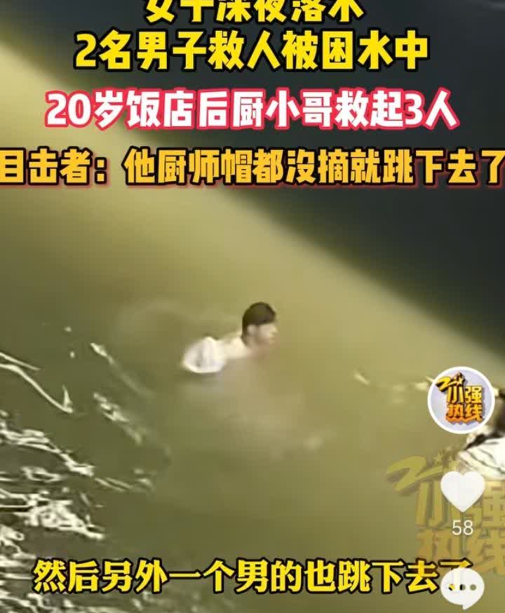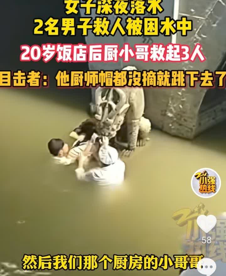 浙江湖州,据目击者称,深夜河里有女子呼喊声,一名疑似女子男朋友,一名女子弟弟,两人跳下水本想救人,结果两人因不懂水性也被困水中,河边饭店一位正在后厨干活的小哥发现后,没来及脱衣服摘帽子就立马跳进河里,把三人拖到桥柱下救了上来。 虽然没有说女子为何落水,但是他男朋友和她弟弟两人也是够添乱的,在危及到生命安全的时候就不能意气用事,自己都不会游泳这不是妥妥的跳下去“送人头”。 发生这种情况,在不会游泳的情况下应该及时呼救,寻求路人帮助然后拨打报警电话。 可能也是几人命不该绝,饭店厨师见义勇为,勇敢跳水救了几人,救命之恩希望几人能好好感谢这位救命恩人,不能让好心人寒了心。对此,大家觉得呢?