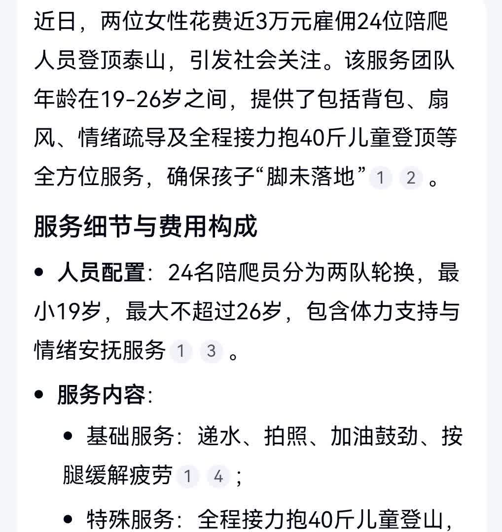 钱不是问题。 近日,两女子花3万请24位陪爬登顶泰山,这真的是一次花钱的享受。 这个财力真是远超一般人啊。 毕竟绝大多数人都不会干出这样的事情。 因为会心疼钱。 这群人提供情绪价值,把顾客哄得非常的开心。