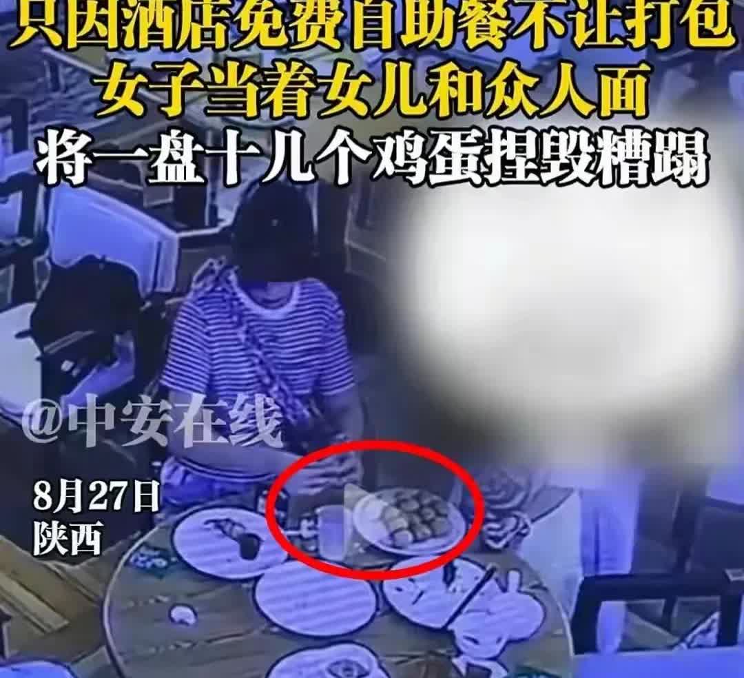 今酒店自助餐捏蛋姐泄愤,火遍全网! 酒店监控公布,全网一片哗然,起因很简单,女子带娃去酒店内吃自助餐,吃完女子要打包一盘鸡蛋大概有十几个,酒店工作人员告知自助餐不能打包,女子非常气愤:你不让我带,我也不让你们再卖! 此女平常一定非常霸道跋扈,不讲道理,唯我独尊,绝对不是一只好鸟! 这是经常蹭吃蹭喝习惯了!当着女儿的面,真做得出来!她女儿有这样的母亲也是一种悲哀! 看到最后才是最气人的:我以为拨完带走了,却是全部捏掉丢桌上,简直丧尽天良,不怕天打雷劈烂肠么?!