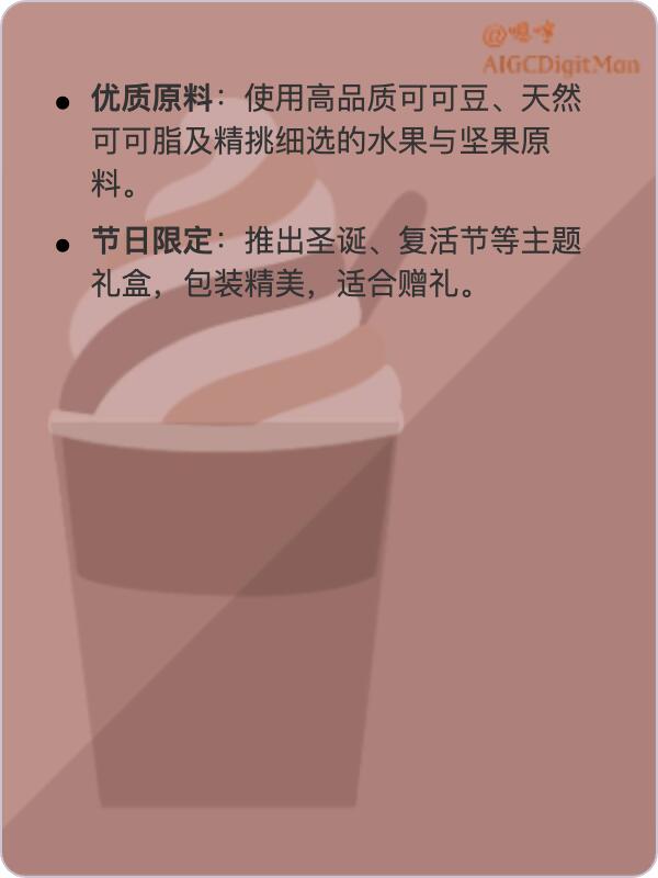 优质原料:使用高品质可可豆、天然可可脂及精挑细选的水果与坚果原料。